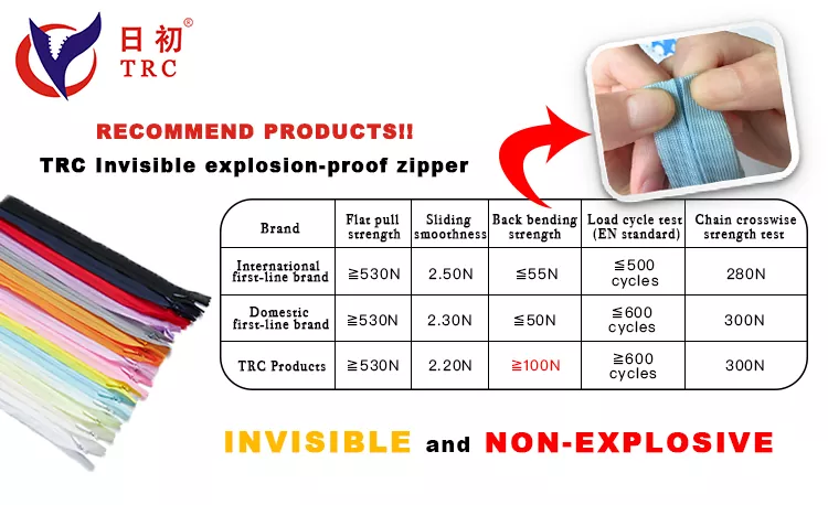 Cada zíper invisível à prova de explosão TRC é cuidadosamente inspecionado durante toda a produção, desde a seleção da matéria-prima até a montagem final. Testes rigorosos de resistência à tração, suavidade e durabilidade garantem um desempenho consistente, proporcionando um zíper confiável que atende aos padrões internacionais de qualidade.