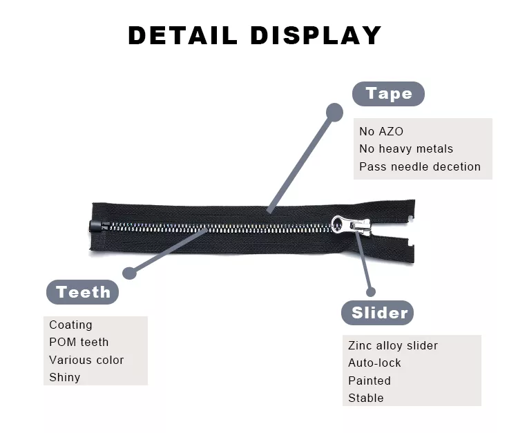 O zíper revestido de plástico TRC apresenta um revestimento de superfície especializado aplicado à estrutura convencional da corrente com dentes de resina, tornando os dentes mais lisos e compactados. Isto aumenta significativamente a suavidade e a resistência ao desgaste do produto. Ao mesmo tempo, a camada de revestimento aumenta efetivamente a resistência à oxidação e a proteção contra umidade dos dentes, ao mesmo tempo que confere um brilho distinto à aparência, combinando funcionalidade com apelo estético.