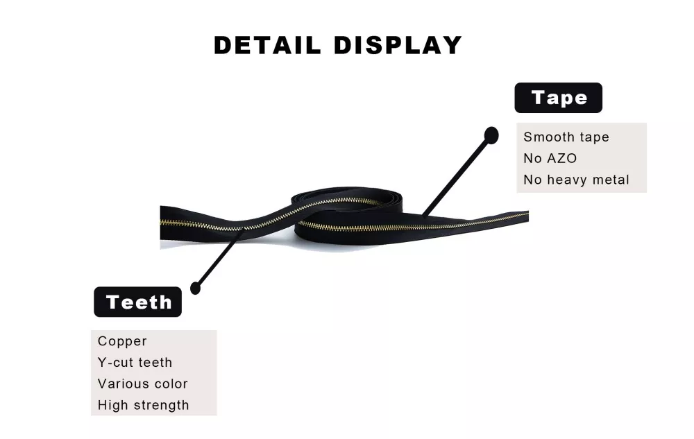 O zíper de metal padrão TRC usa dentes de latão ou níquel de alta resistência, proporcionando excelente resistência ao desgaste, resistência à lavagem e desempenho de engomar resistente ao calor. Além disso, está disponível em cores populares, como ouro champanhe, o que o torna amplamente adequado para jeans, jaquetas e vários outros tipos de roupas.