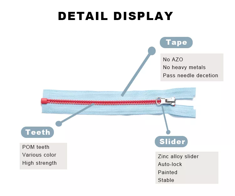 O zíper de plástico padrão TRC é moldado por injeção de polioximetileno ou outros materiais de resina de alta resistência, o que garante que os dentes sejam bem formados, proporcionando excelente suavidade e excelente resistência ao desgaste durante o uso. Suas superfícies suportam diversos tratamentos de cores com excelente solidez da cor, permitindo que as cores permaneçam vibrantes por muito tempo. Além disso, combinada com fita de poliéster de alta resistência, a estrutura geral é mais resistente e durável, atendendo às demandas do uso diário frequente.