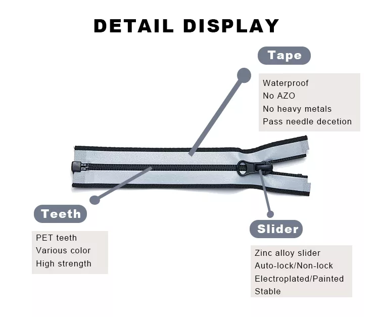Os zíperes de náilon resistentes à água TRC são feitos de dentes de náilon de alta densidade e fita de poliéster reforçada, sobrepostos com um filme durável de TPU ou PU. Isso cria uma barreira contínua que fornece resistência eficaz à água, mantendo a flexibilidade e a operação suave do zíper. Projetado para aplicações externas e de alto desempenho, este produto oferece resistência durável à abrasão, corrosão e deformação. Seja usado em jaquetas, roupas esportivas, mochilas, barracas ou equipamentos de proteção, o zíper de náilon resistente à água TRC alcança um equilíbrio ideal entre proteção funcional e design moderno, garantindo que cada detalhe seja elegante e funcional.